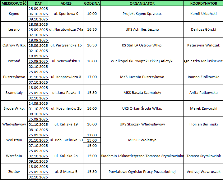 Harmonogram zawodów w poszczególnych wybranych lokalizacjach: