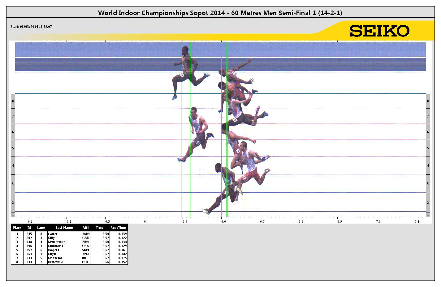 Foto finish biegu półfinałowego na 60m. ( Remigiusz Olszewski 2 od dołu)