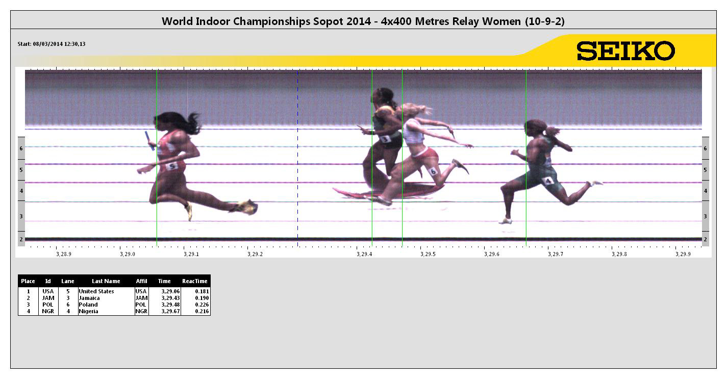 Foto finish biegu rozstawnego 4×400 m (na czwartej zmianie na III pozycji finiszuje Małgorzata Hołub)